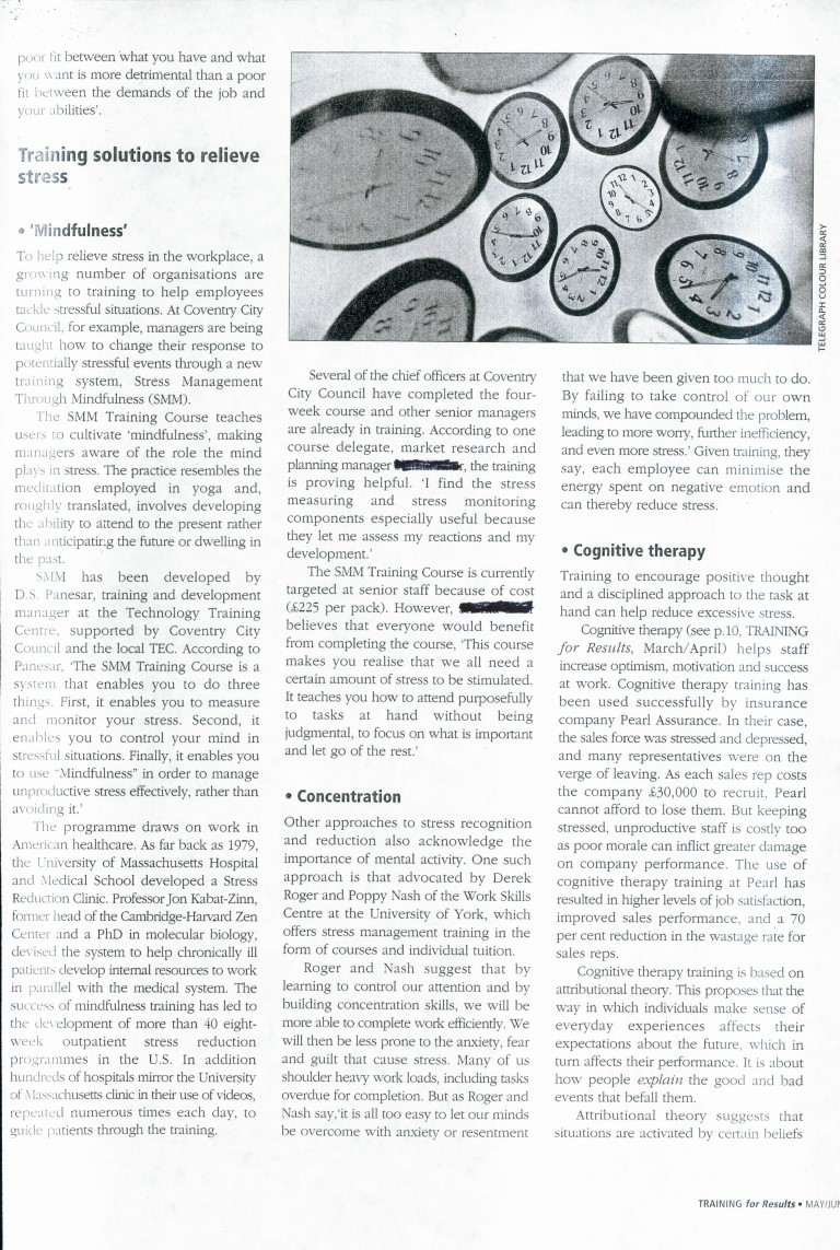 Bespoke 4 week course introducing mindfulness for work related stress. Introducing "Mindfulness" as a stress reduction method, featured in the prestigious "Training for Results" journal May 1995