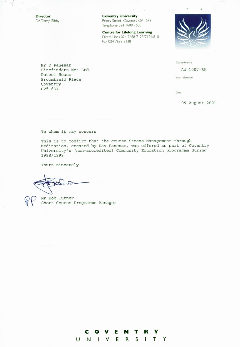 Dav has proved to be a pioneer in his research and application of mindfulness for health, work and self-discovery or transpersonal growth, for more than 20+ years. He has been formally teaching mindfulness since 1995 as health interventions, and was the first person in the UK to develop and deliver Mindfulness based stress reduction courses through Coventry University.